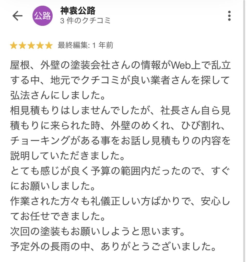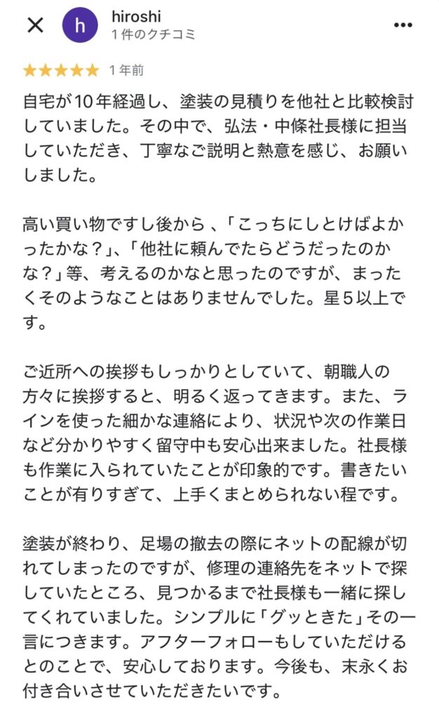 人柄が温かくて、塗装についての熱意を感じました。(Google口コミより)