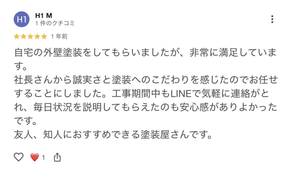 H1 M様 この度は数ある塗装業者の中から弊社をお選びいただき、誠にありがとうございました❗️ また、大変嬉しい口コミを頂き、心より感謝申し上げます🌈✨ 誠実さや […]