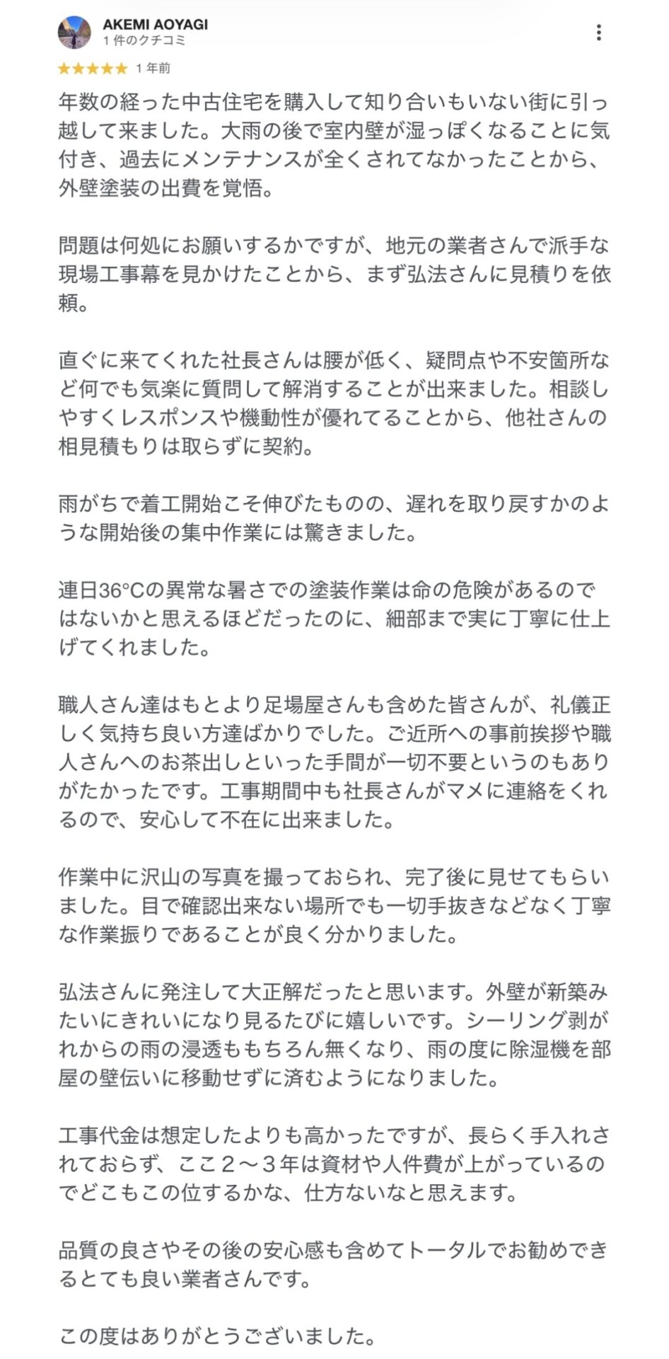 工事費もリーズナブルで弘法さんにお願いして本当に良かった!!小田原市の外壁塗装後のお客様の声(Google口コミより)