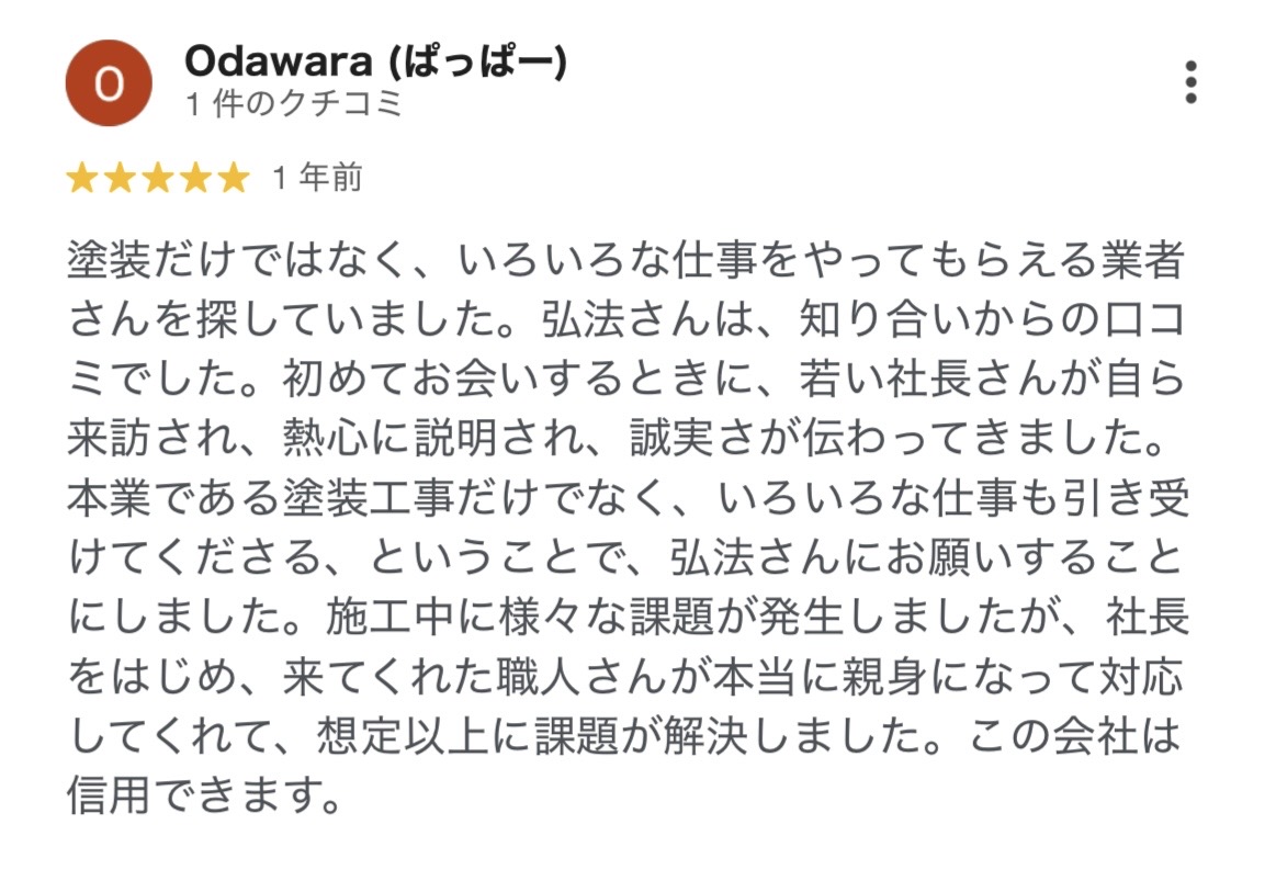 塗装工事だけでなく、さまざまなお困りごとに対応できるよう心がけておりますので、お力になれたことを何より嬉しく思います。