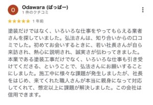 現場をよく見てくれて、社長さんの真摯な対応に信頼感、安心感、小田原市の外壁塗装後のお客様の声(Google口コミより)